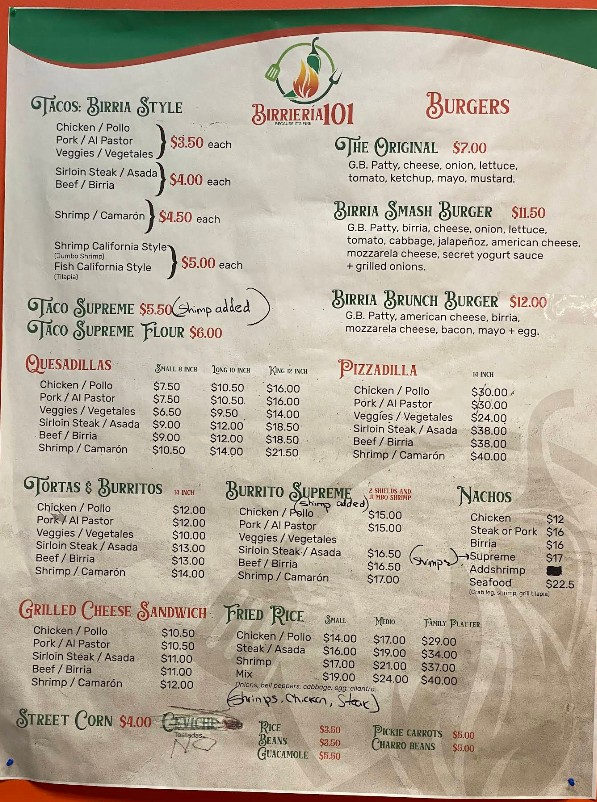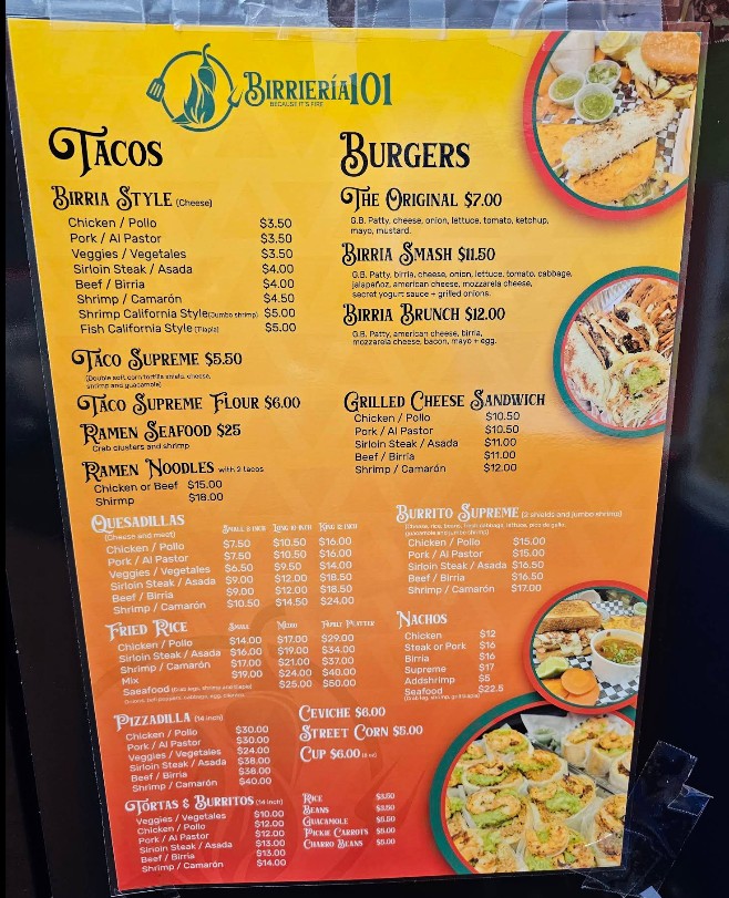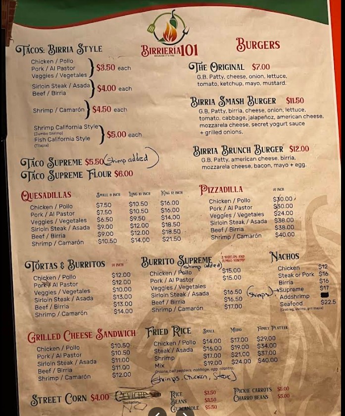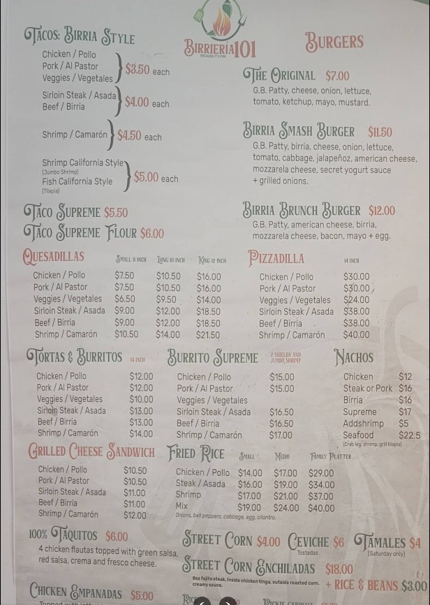 Welcome to Birrieria 101, a must-visit spot for authentic Mexican flavors in Greenville. The birrieria-101 Restaurant menu is known for its signature birria tacos, rich consommé, and flavorful quesabirria that keep customers coming back. Alongside its famous dishes, the menu offers a variety of traditional Mexican favorites prepared with fresh ingredients and bold spices. Whether you're dining in or ordering takeout, explore the full menu to find popular items, updated prices, and a true taste of Mexican street food.